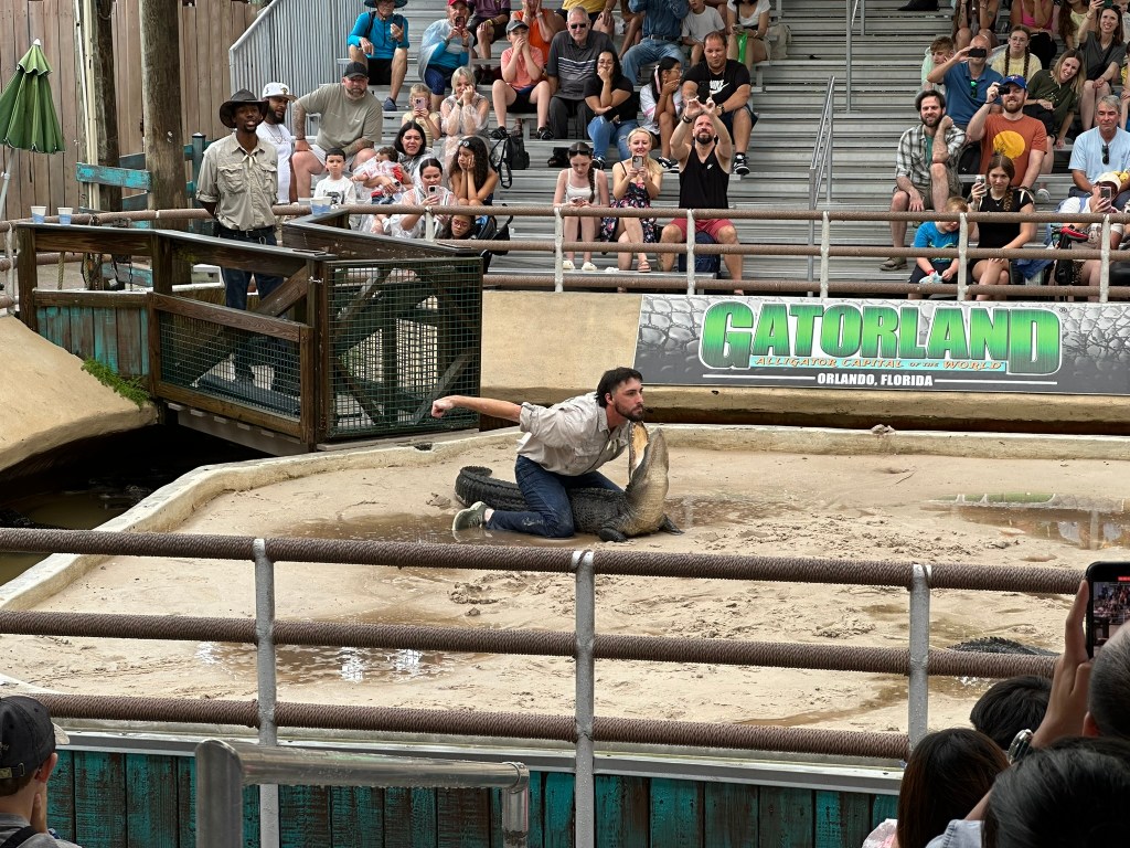 What made the day unforgettable was Florida’s unpredictable weather. A perfectly sunny morning flipped into a full-on storm, and I thought for sure the shows would be canceled. I was wrong! Gatorland delivered in true Florida fashion. The Gator Jumparoo Show went on in the pouring rain, with lightning flashing in the distance—it was wild to watch. Then came Alligators: Legends of the Swamp, staged on a sand-covered arena that had turned into a small lake. The crew was out there pumping water off the stage, and like clockwork, the show still started right on time. Having worked at a theme park before, I was seriously impressed. Big shoutout to the Gatorland staff and performers for making it happen.
